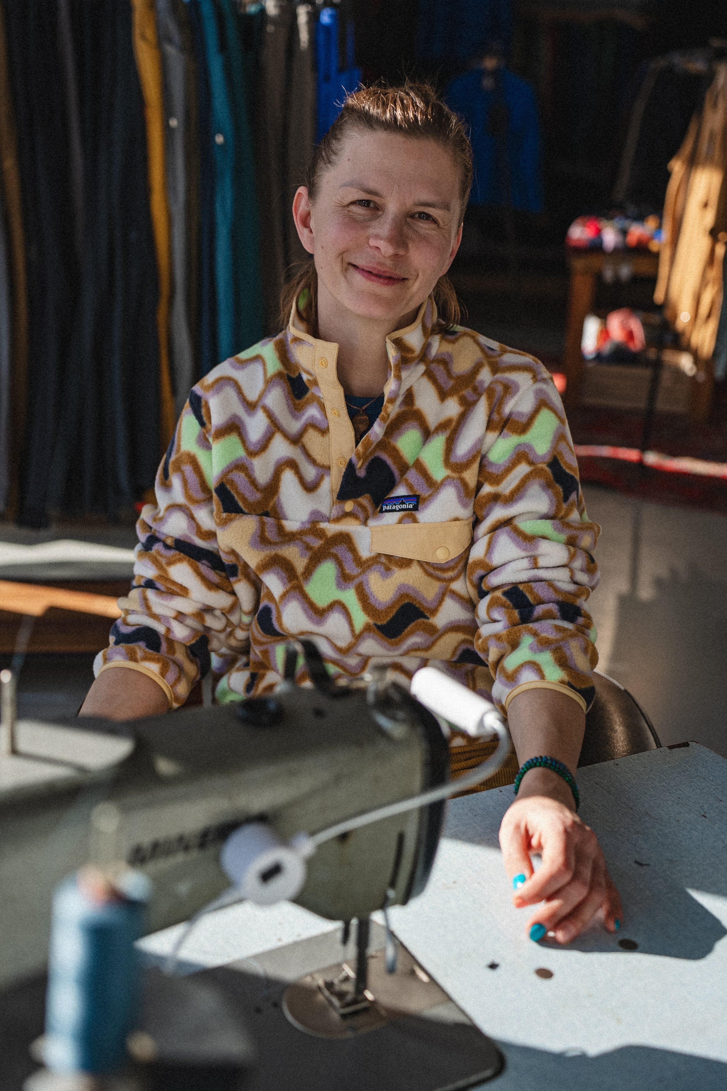 Monika collaborates with the brand Patagonia, supporting the Worn Wear initiative, which encourages repairing and reusing clothing instead of throwing it away. Her work is a blend of craftsmanship, ecology, and heart—all in service of creating responsibly and beautifully.